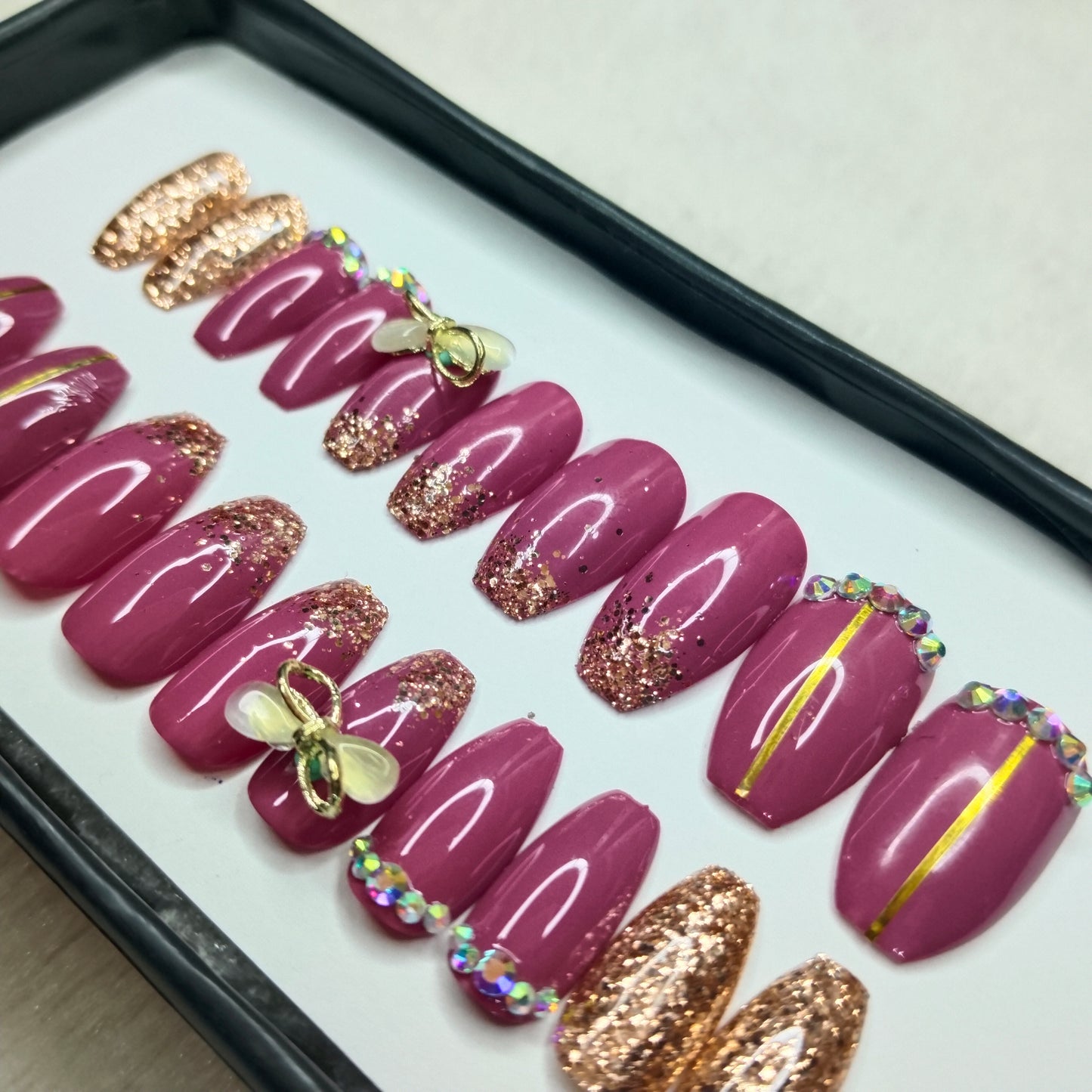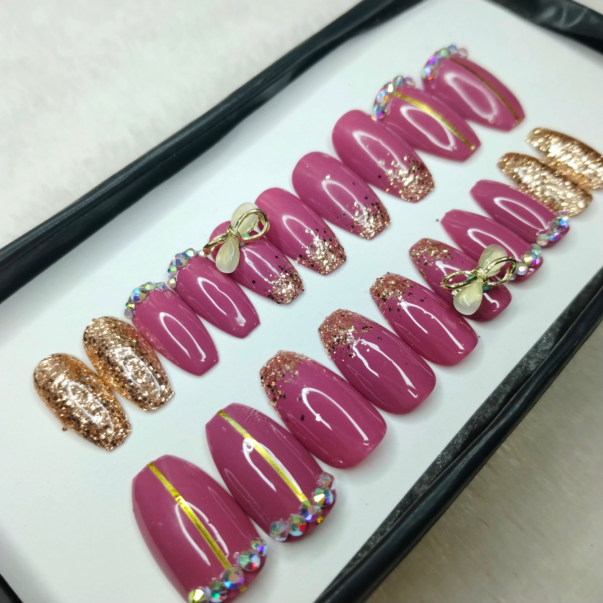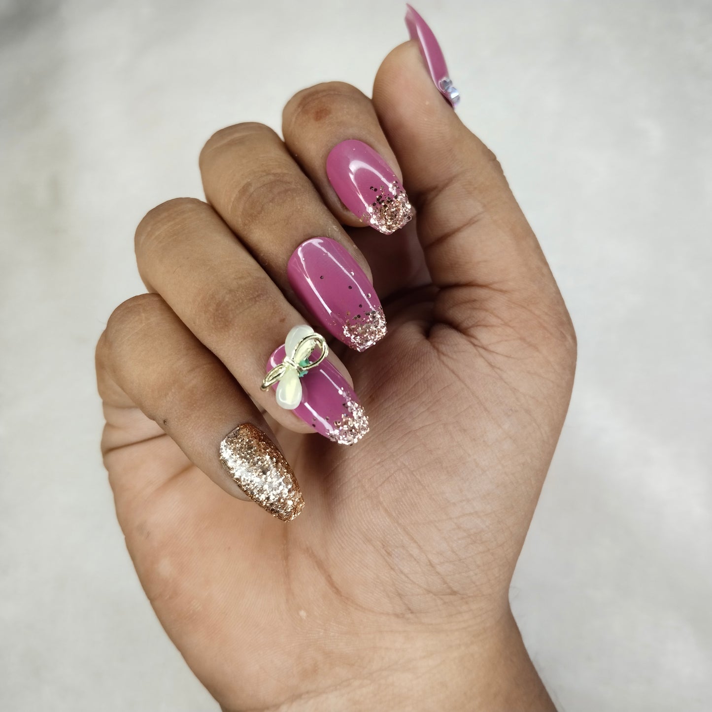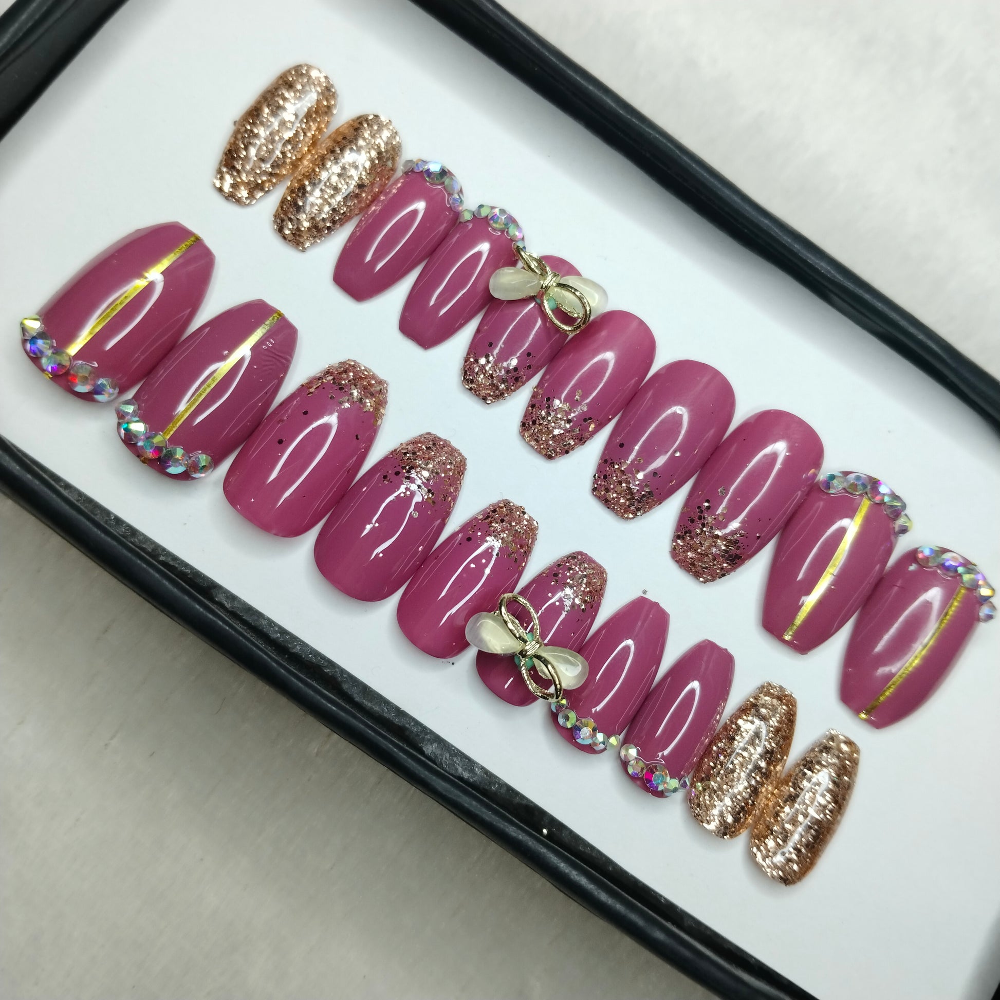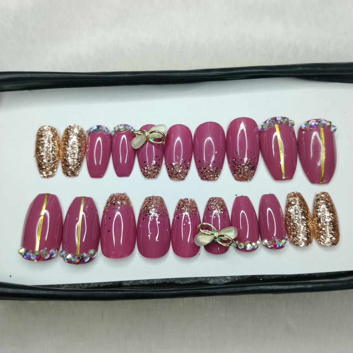 The NailzStation Glossy Pink Glitter 3D Press on Fake Artificial Nails Set with glue, filer, sticker application kit // 1192