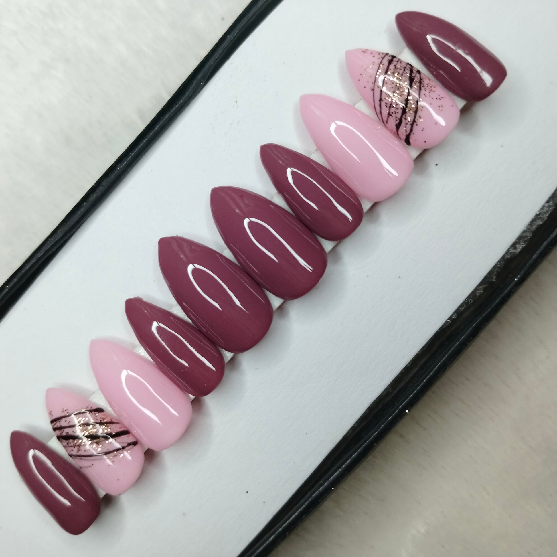 The NailzStation Glossy Pink Swirls Press on Fake Artificial Nails Set with glue, filer, sticker application kit // 1410