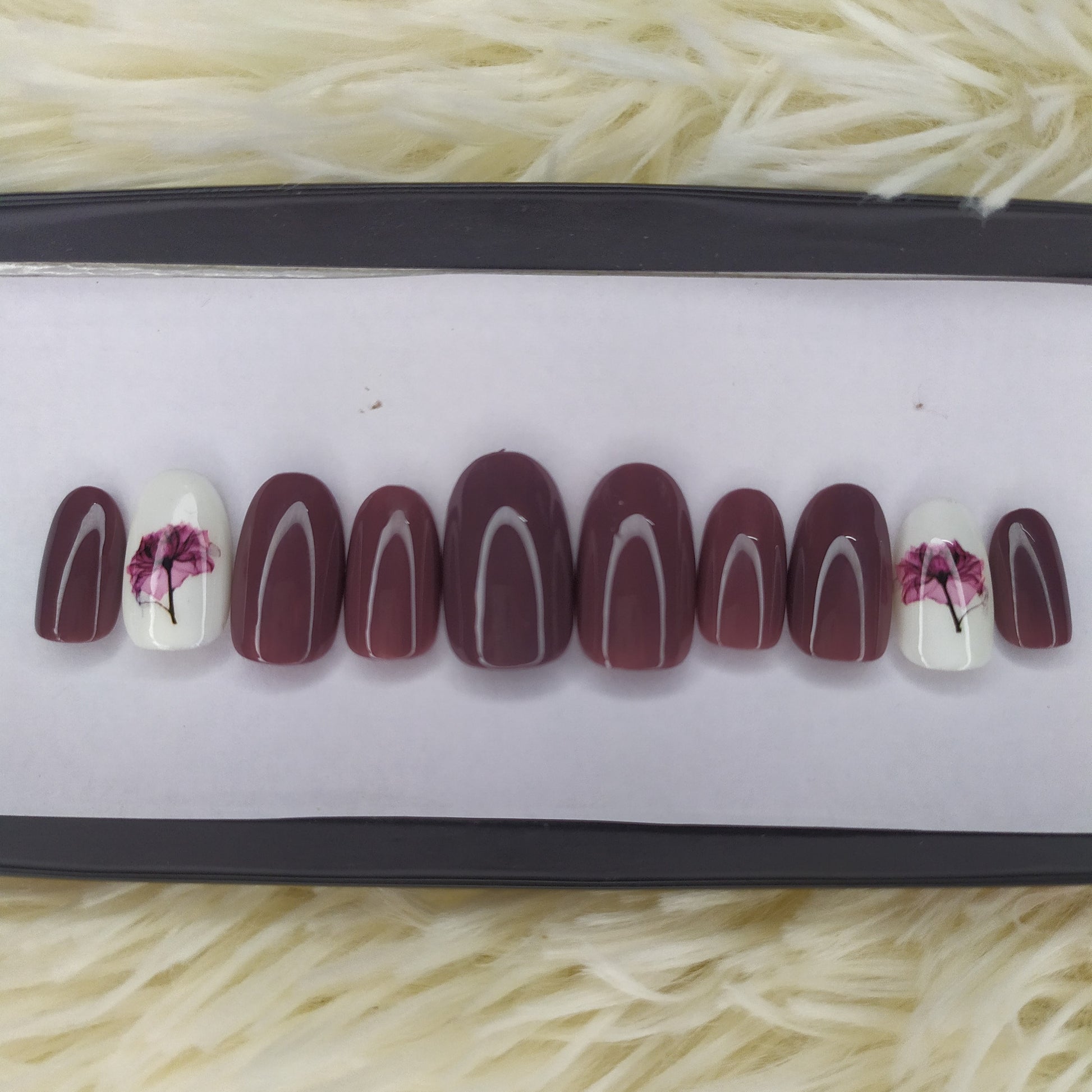 The NailzStation Glossy Plum Floral Press on Fake Artificial Nails Set with glue, filer, sticker application kit // 1348