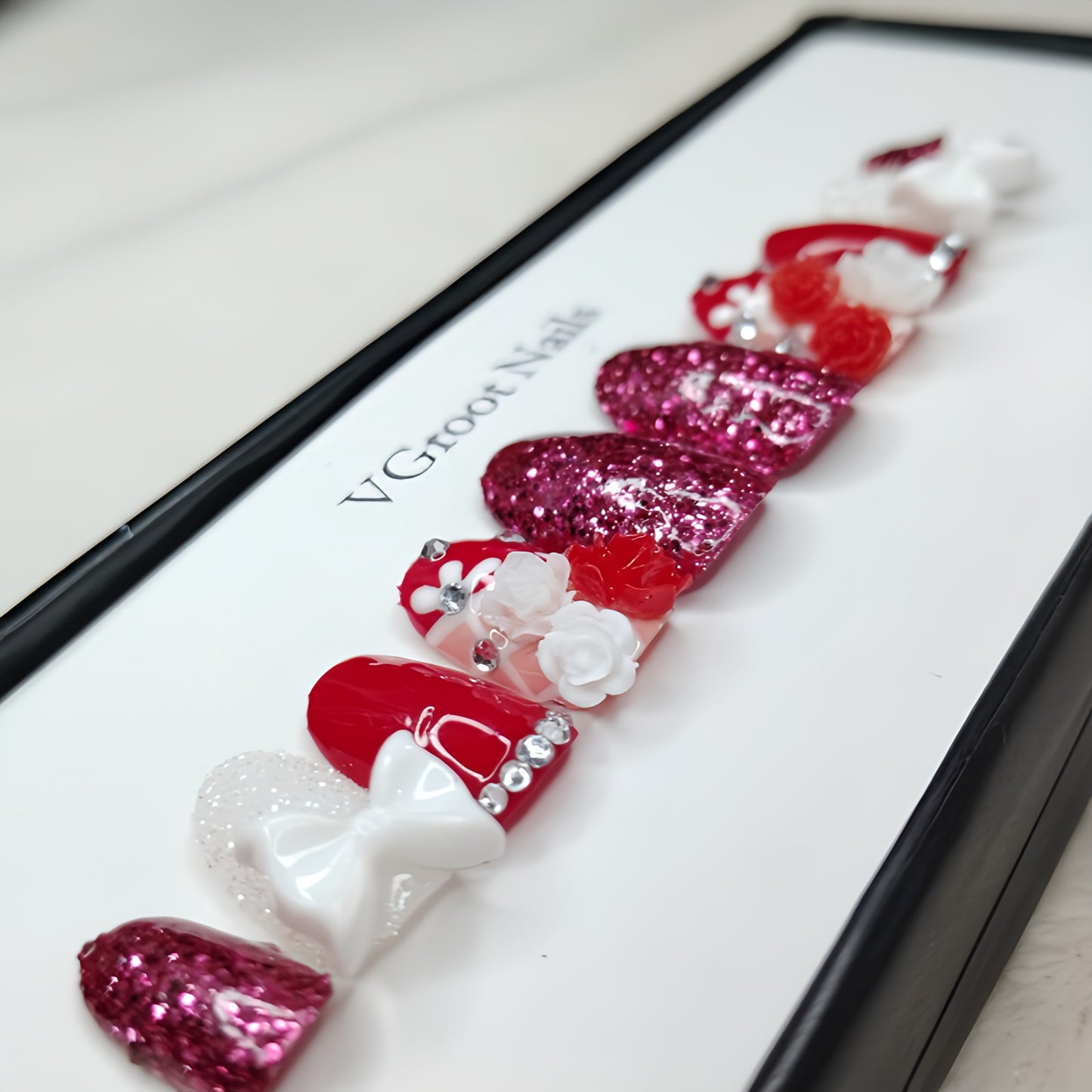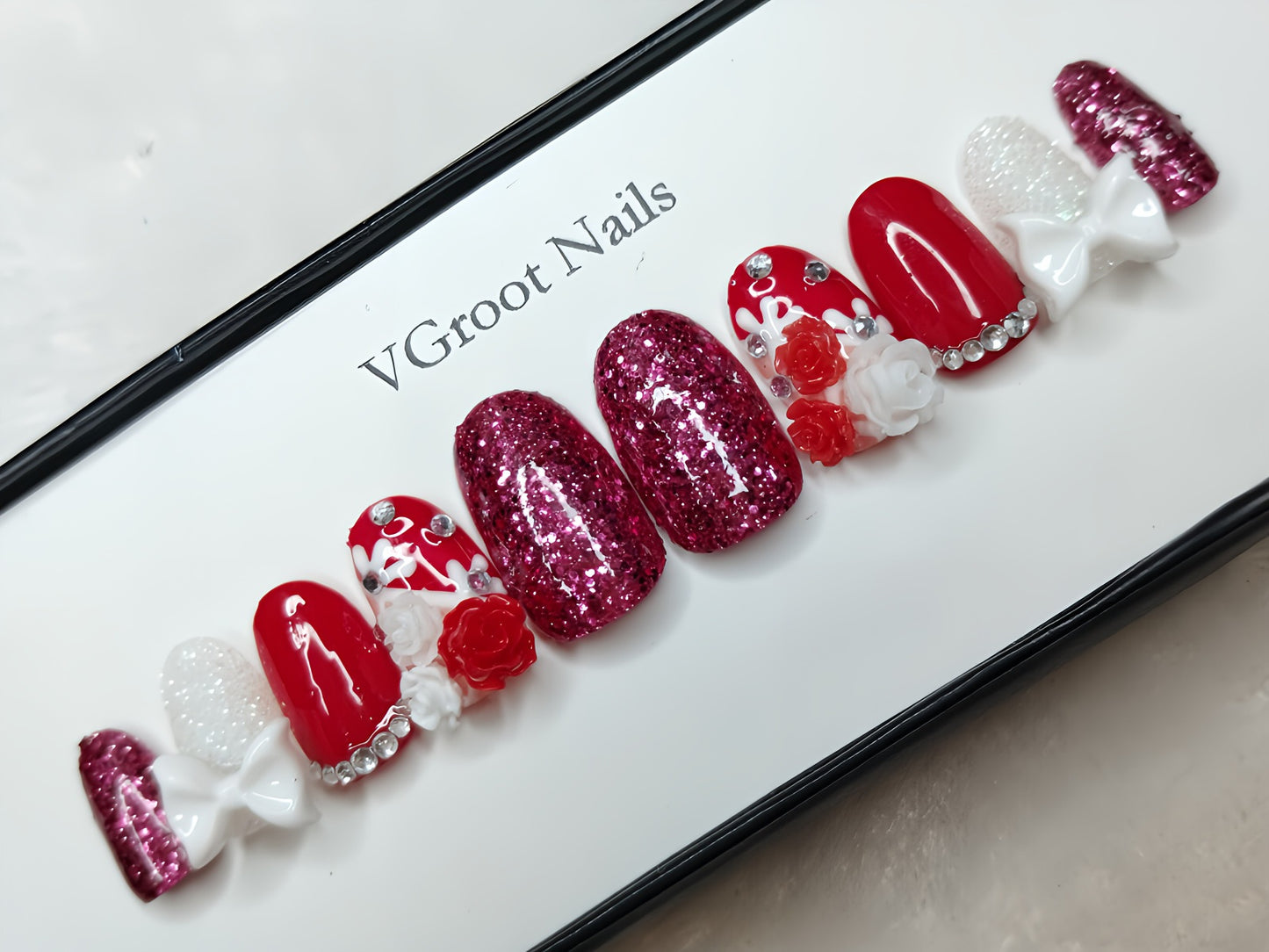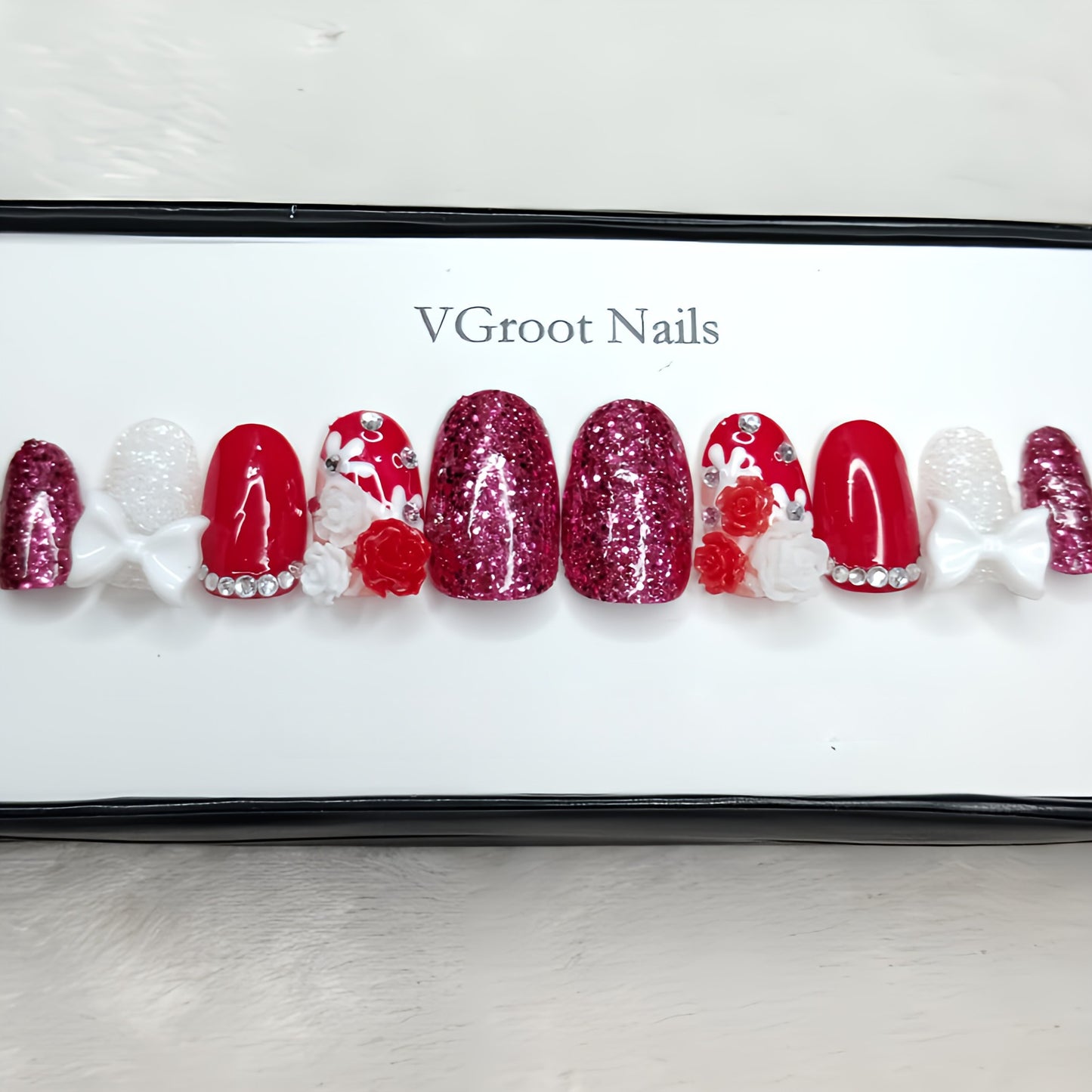 The NailzStation Glossy Red 3D Roses Press on Fake Artificial Nails Set with glue, filer, sticker application kit // 1039