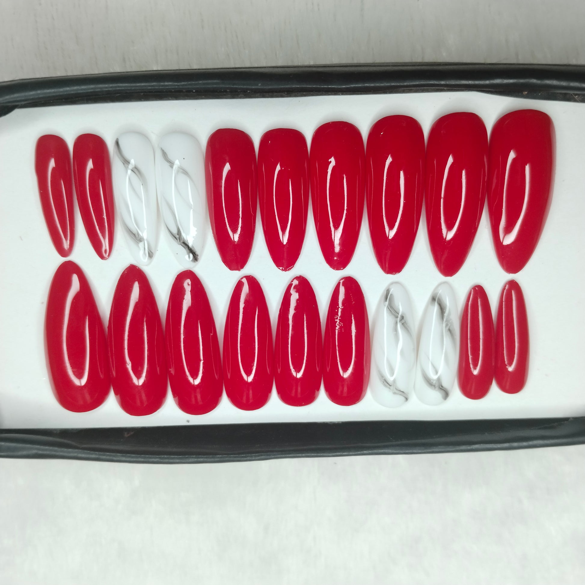 The NailzStation Glossy Red Marble Press on Fake Artificial Nails Set with glue, filer, sticker application kit // 1246