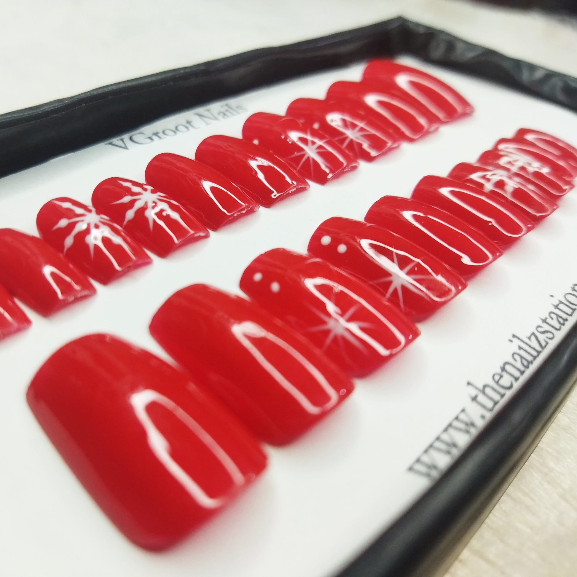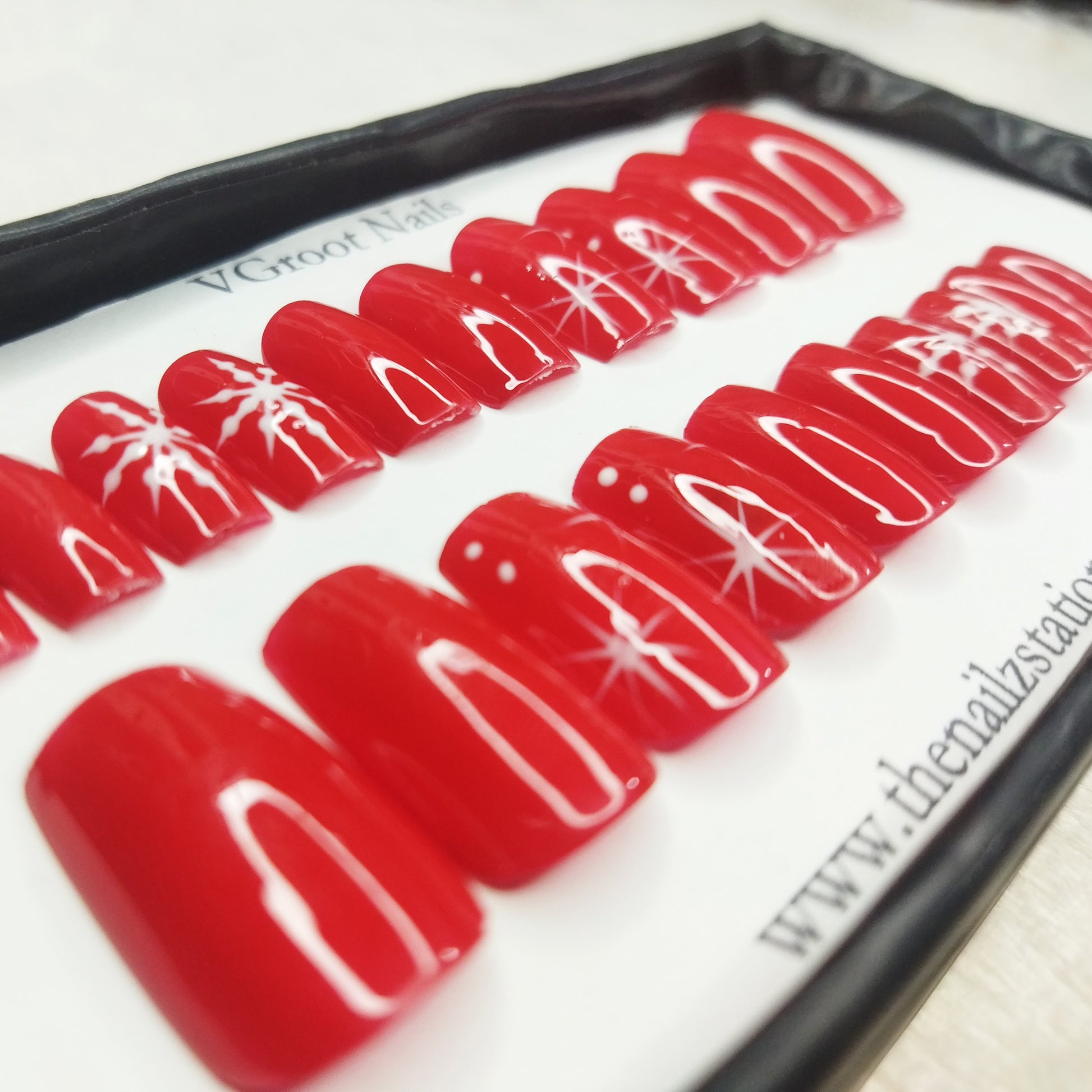 The NailzStation Glossy Red Snowflakes Press on Fake Artificial Nails Set with glue, filer, sticker application kit // 1159