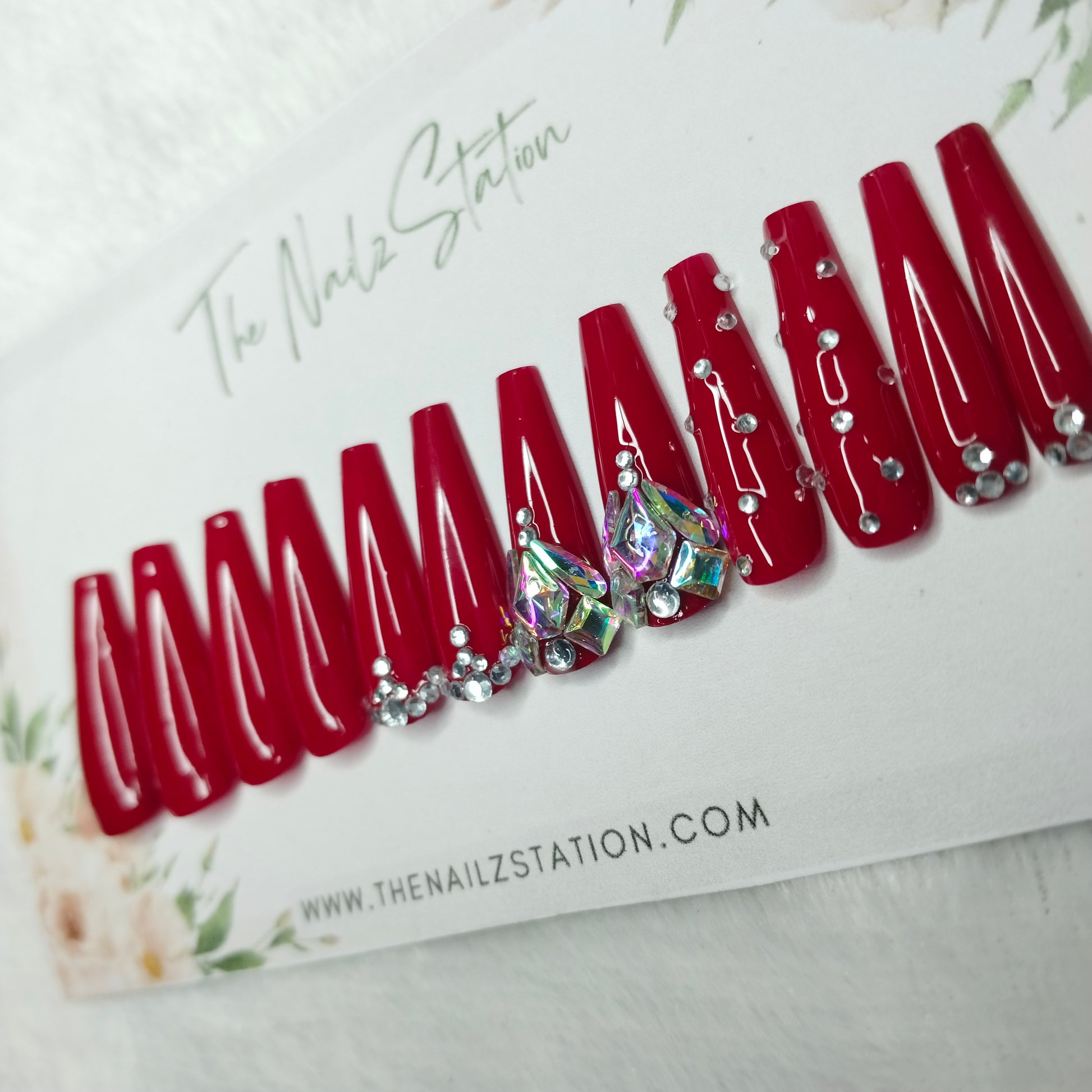 The NailzStation Glossy Red Studded Press on Fake Artificial Nails Set with glue, filer, sticker application kit // 1480