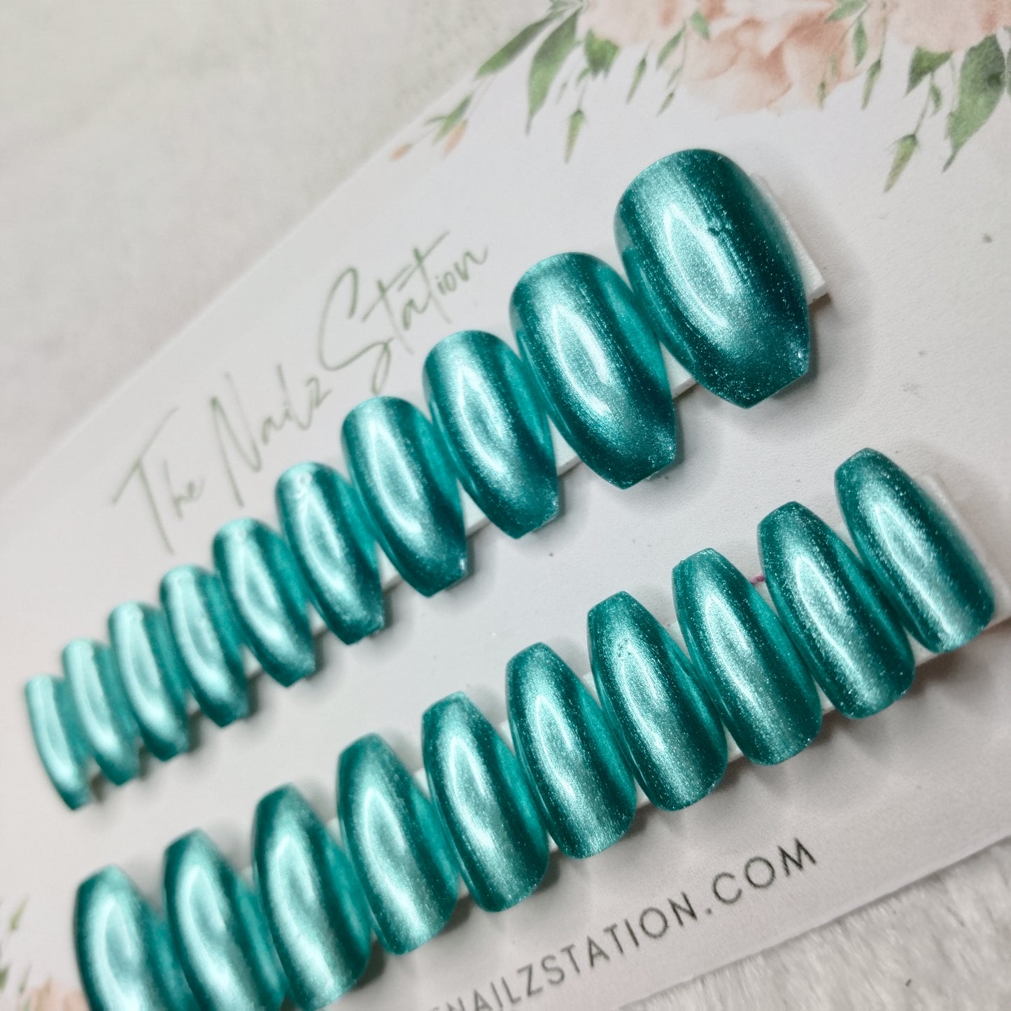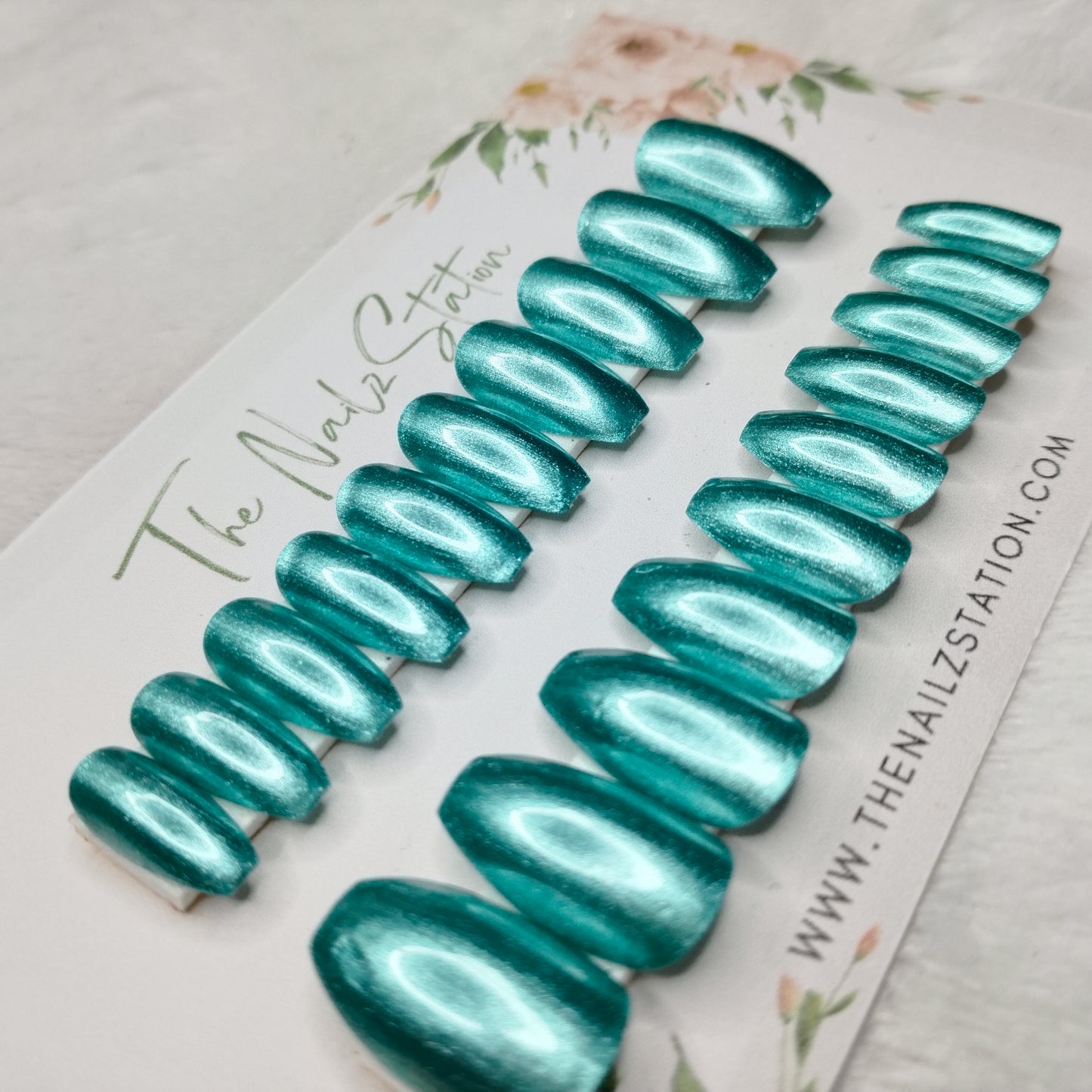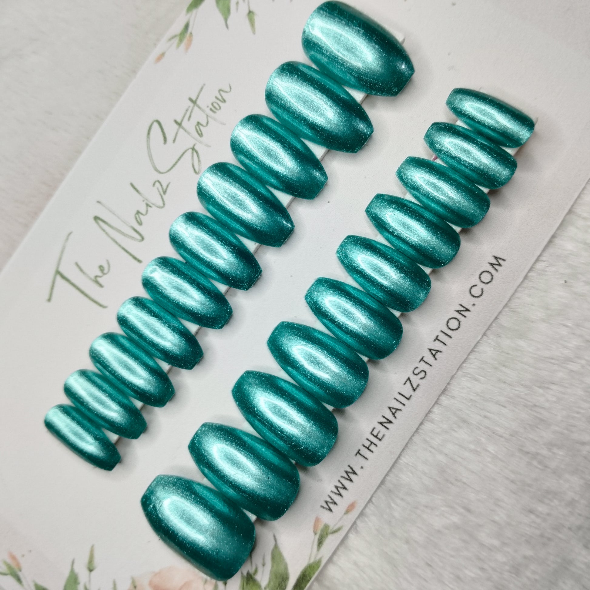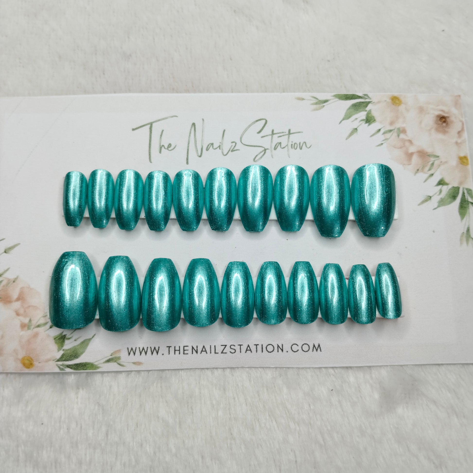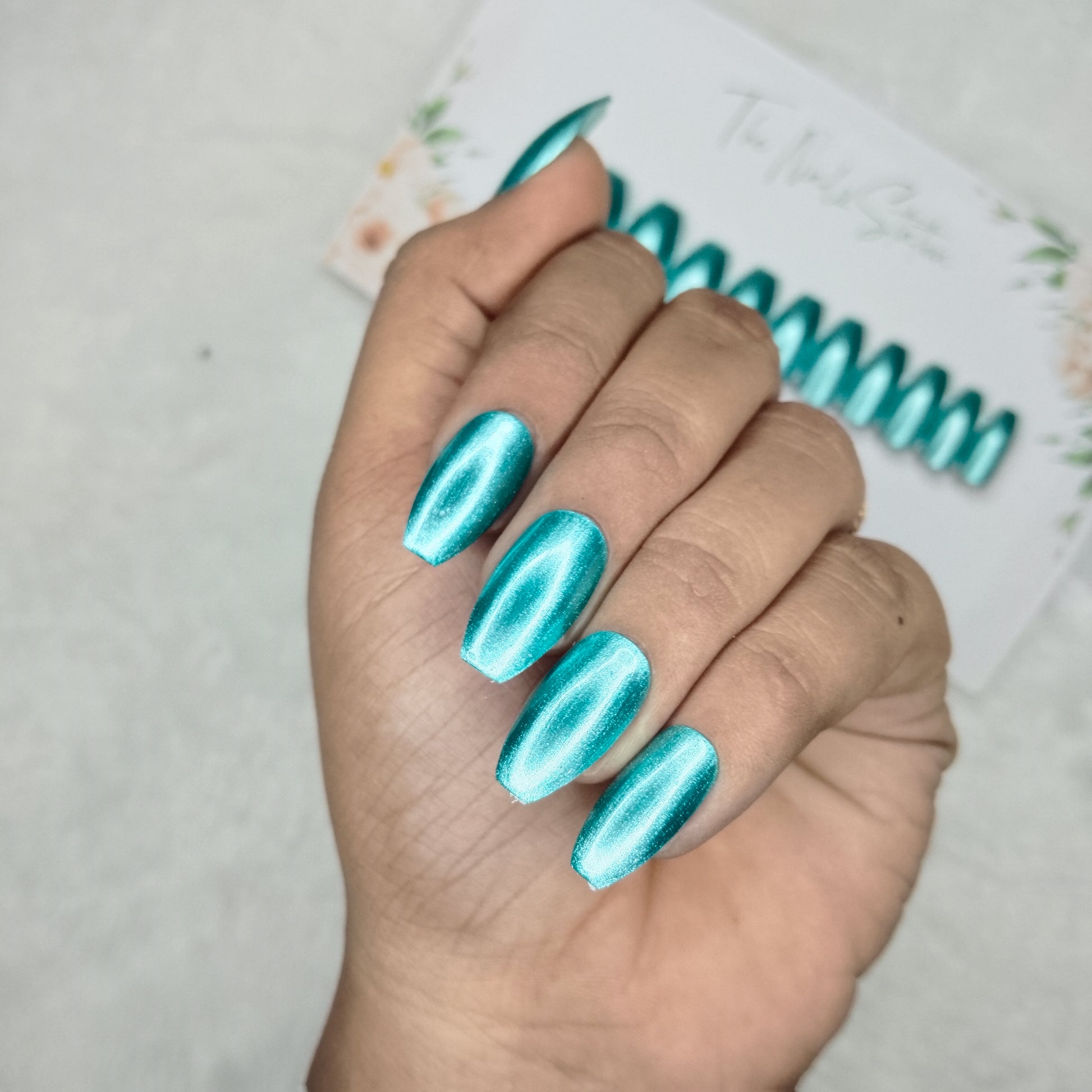 The NailzStation Glossy Sea Blue Chrome Press on Fake Artificial Nails Set with glue, filer, sticker application kit // 1478