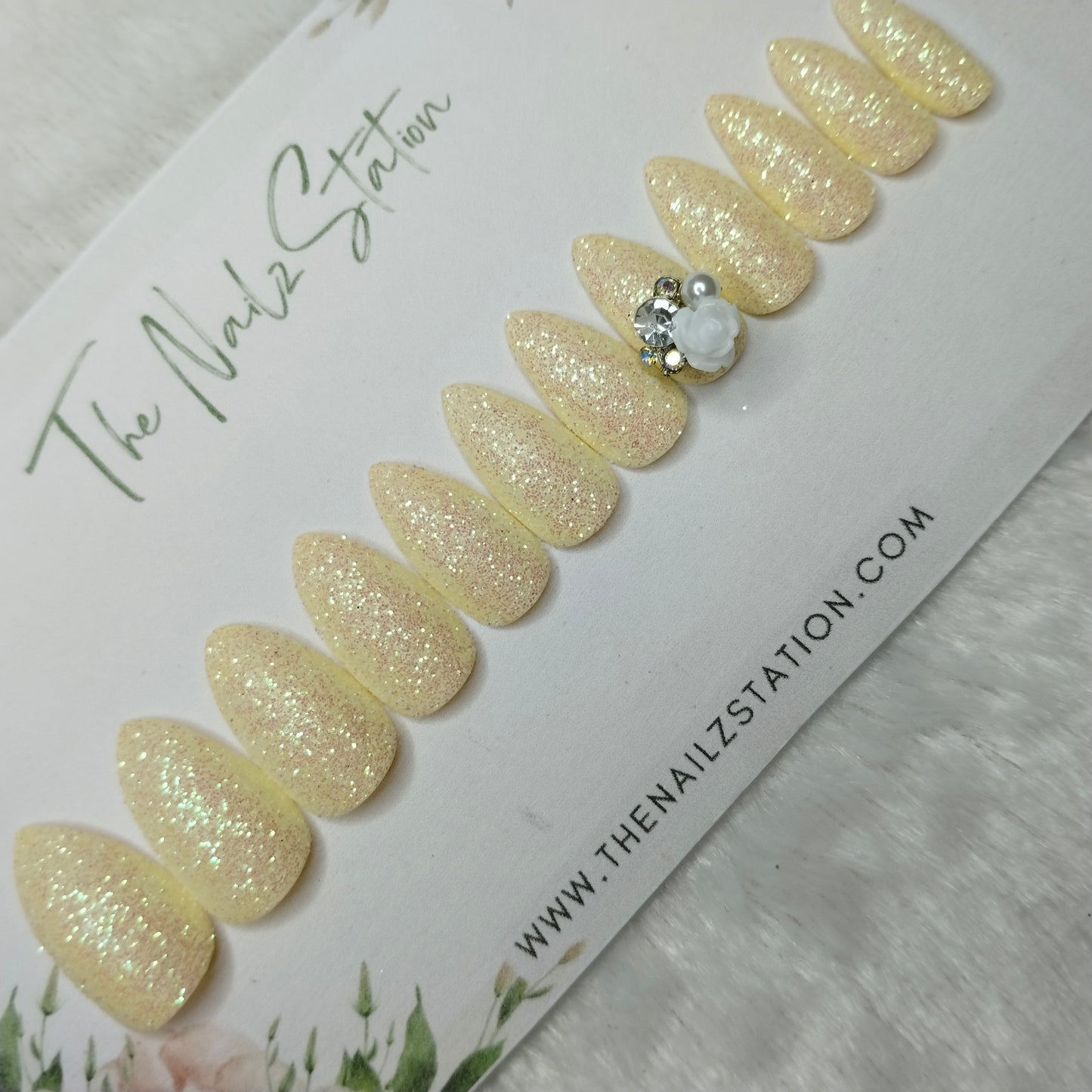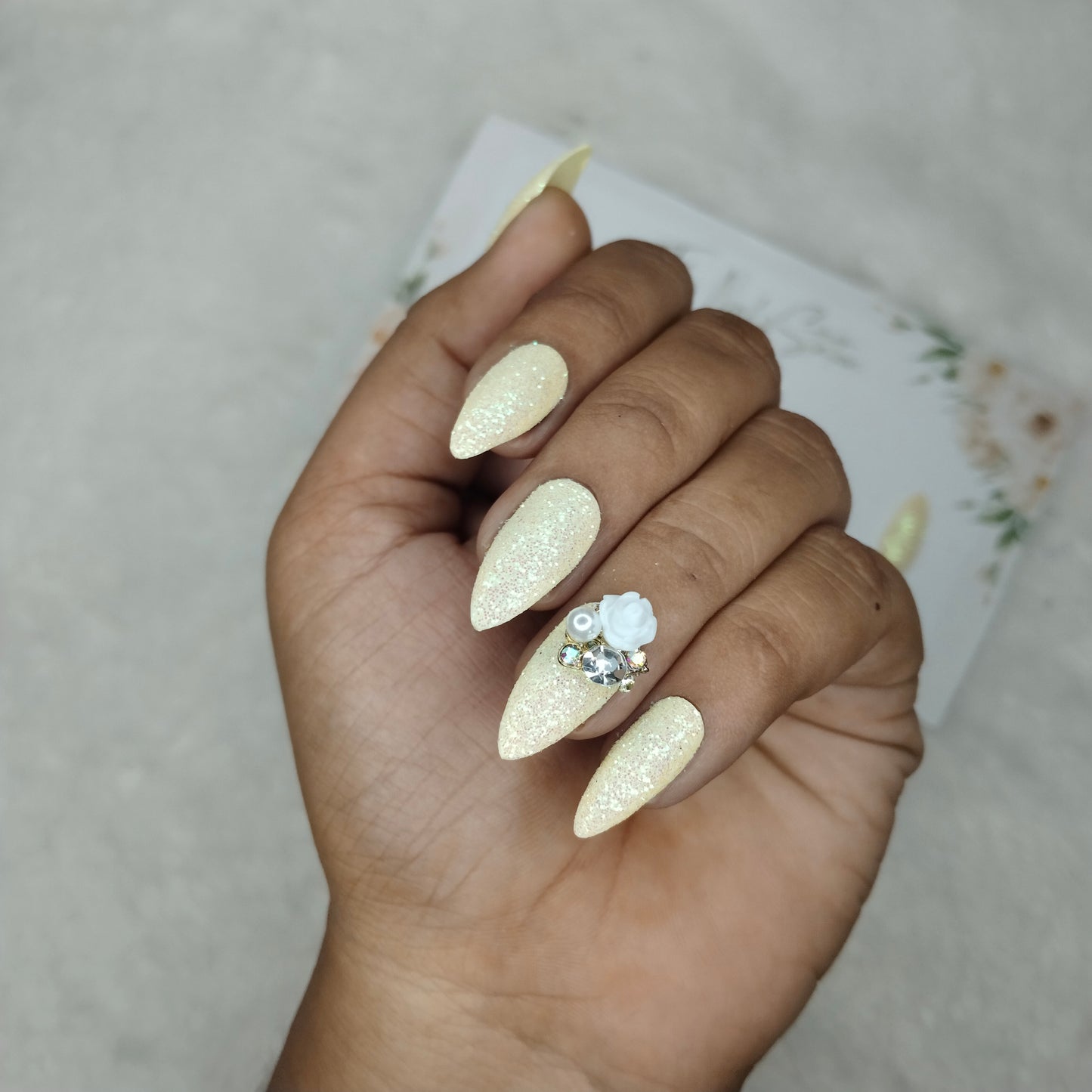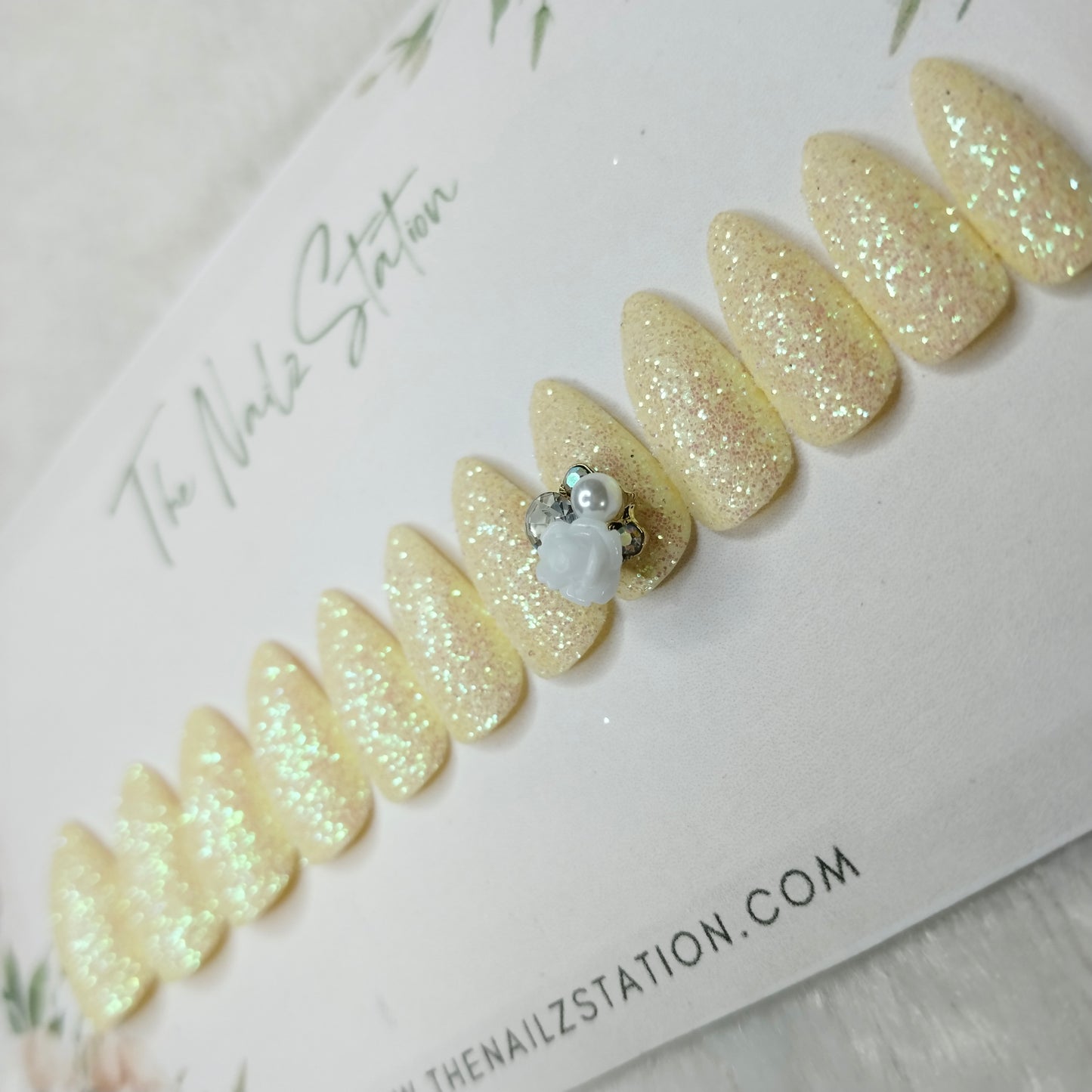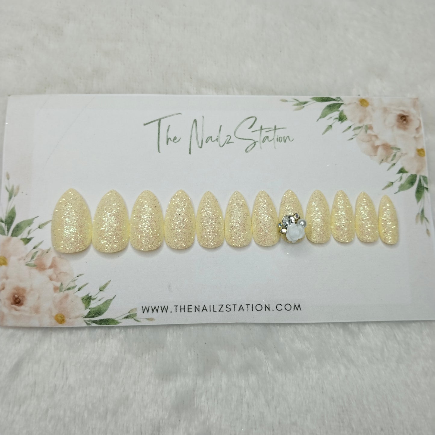 The NailzStation Glossy White Glitter 3D Rose Press on Fake Artificial Nails Set with glue, filer, sticker application kit // 1446