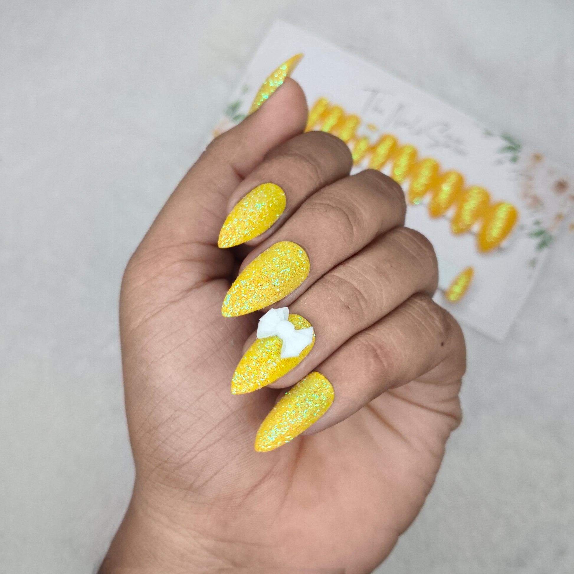The NailzStation Glossy Yellow Glitter 3D Bow Press on Fake Artificial Nails Set with glue, filer, sticker application kit // 1444
