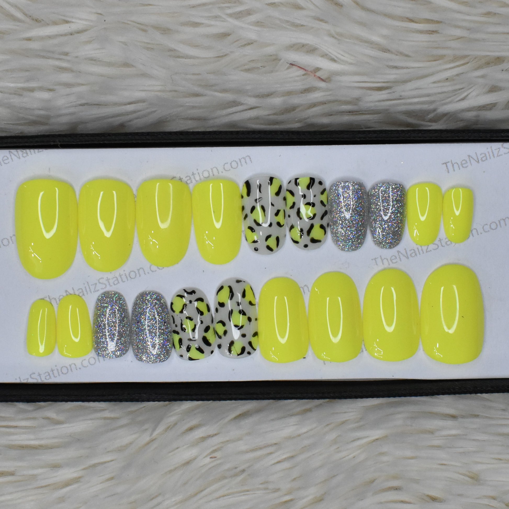 The NailzStation Glossy Yellow Glitter Studded Press on Fake Artificial Nails Set with glue, filer, sticker application kit // 1322