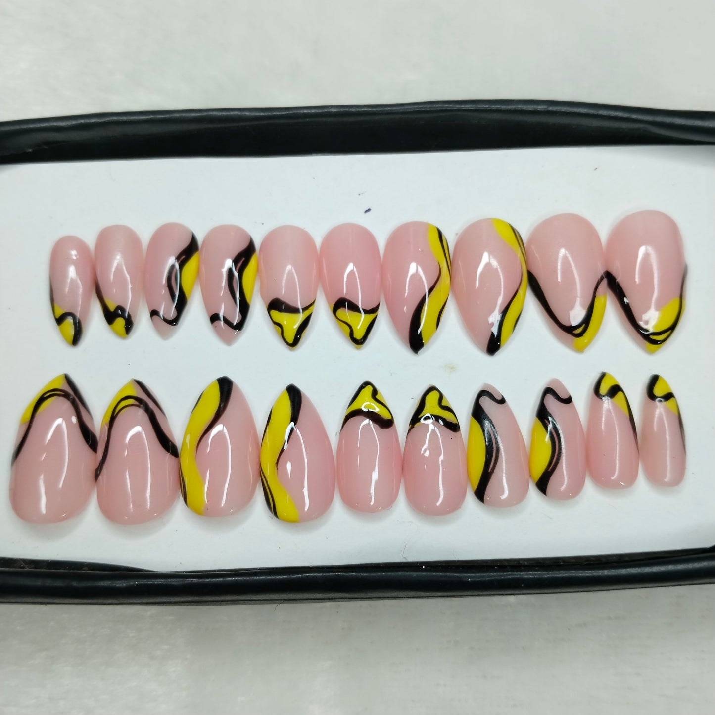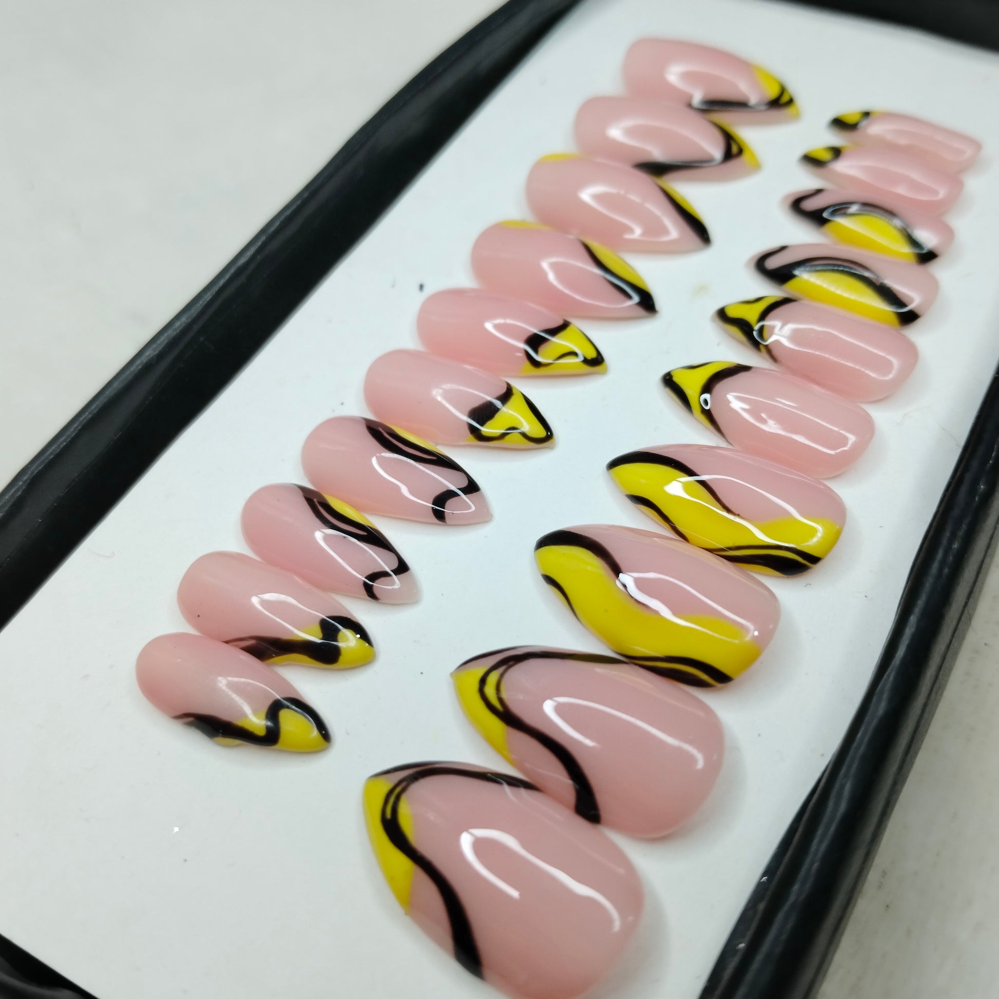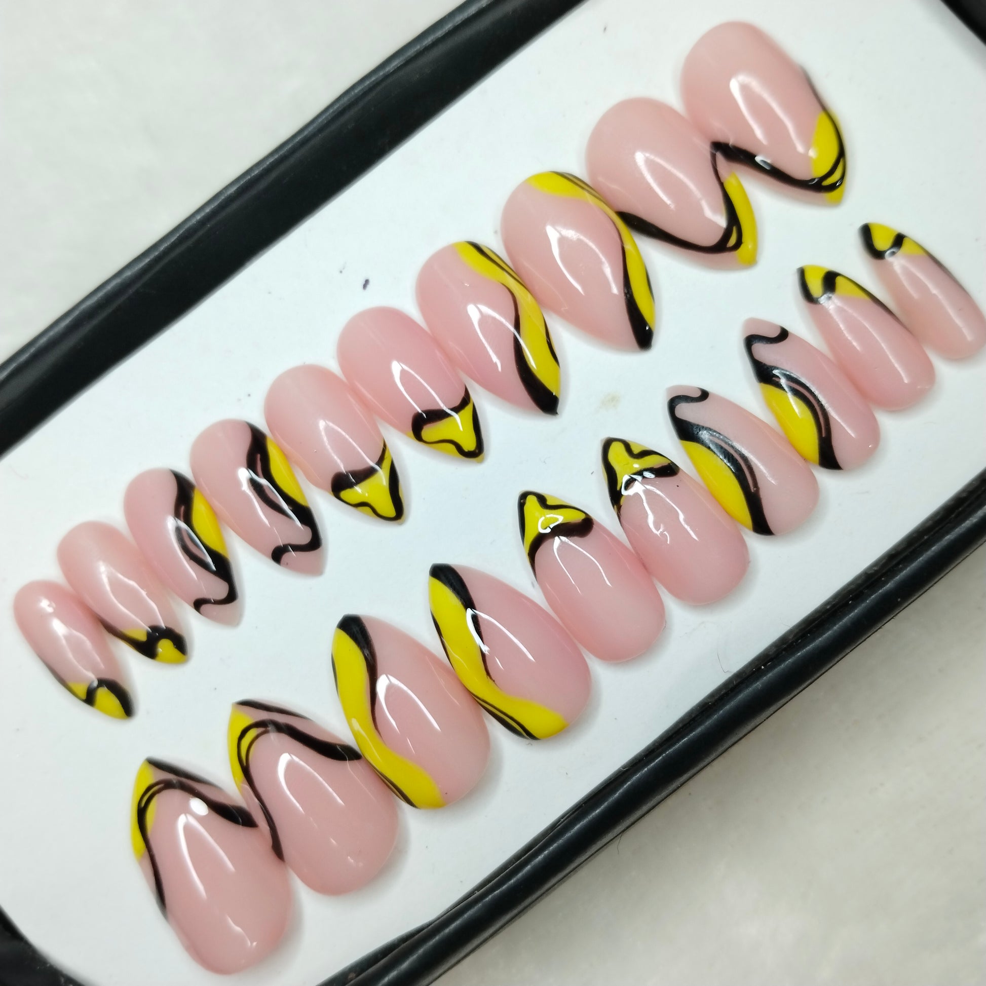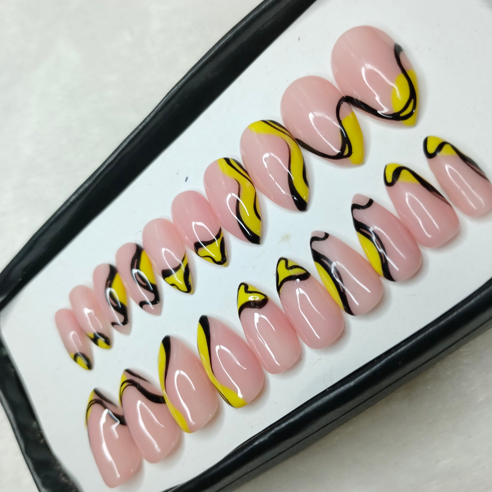 The NailzStation Glossy Yellow Swirls Press on Fake Artificial Nails Set with glue, filer, sticker application kit // 1234