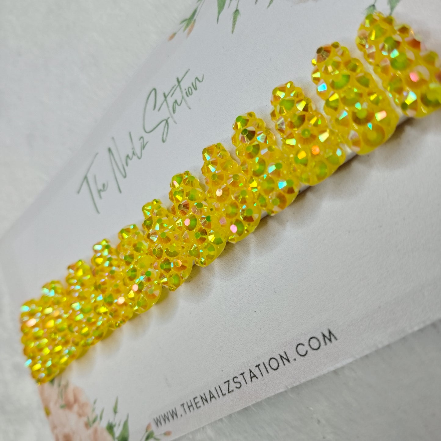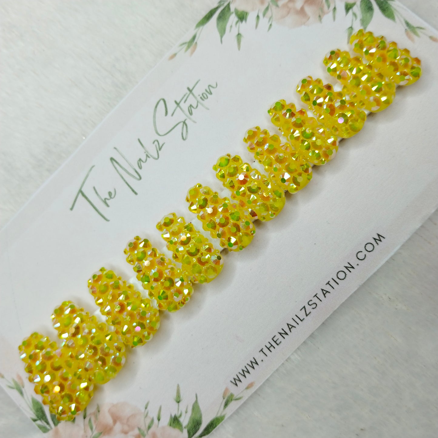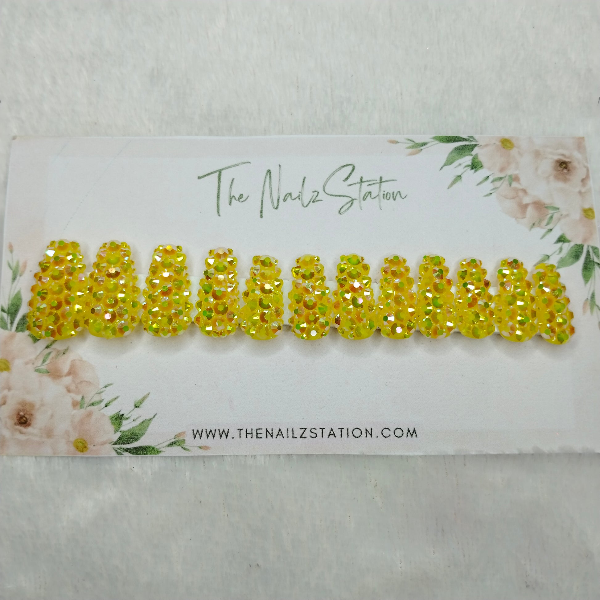 The NailzStation Glossy Yellow Water 3D Stones Press on Fake Artificial Nails Set with glue, filer, sticker application kit // 1525