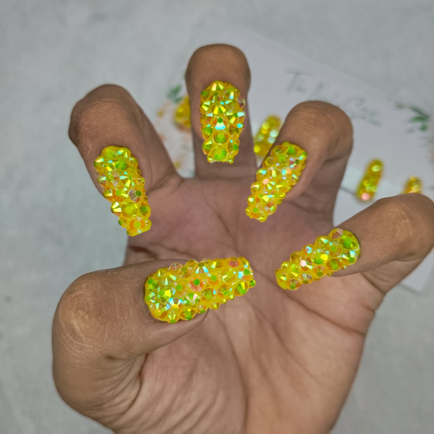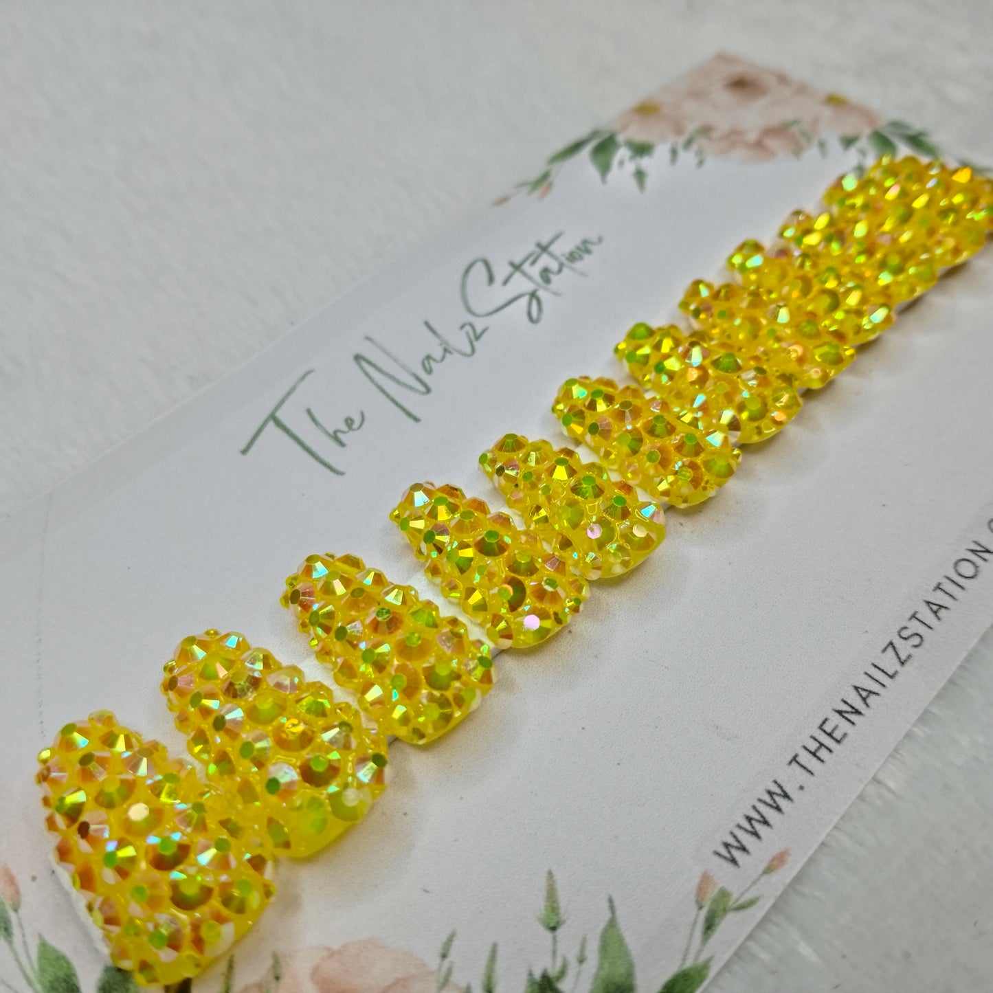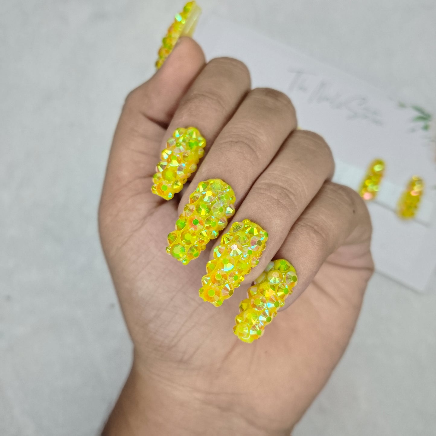 The NailzStation Glossy Yellow Water 3D Stones Press on Fake Artificial Nails Set with glue, filer, sticker application kit // 1525