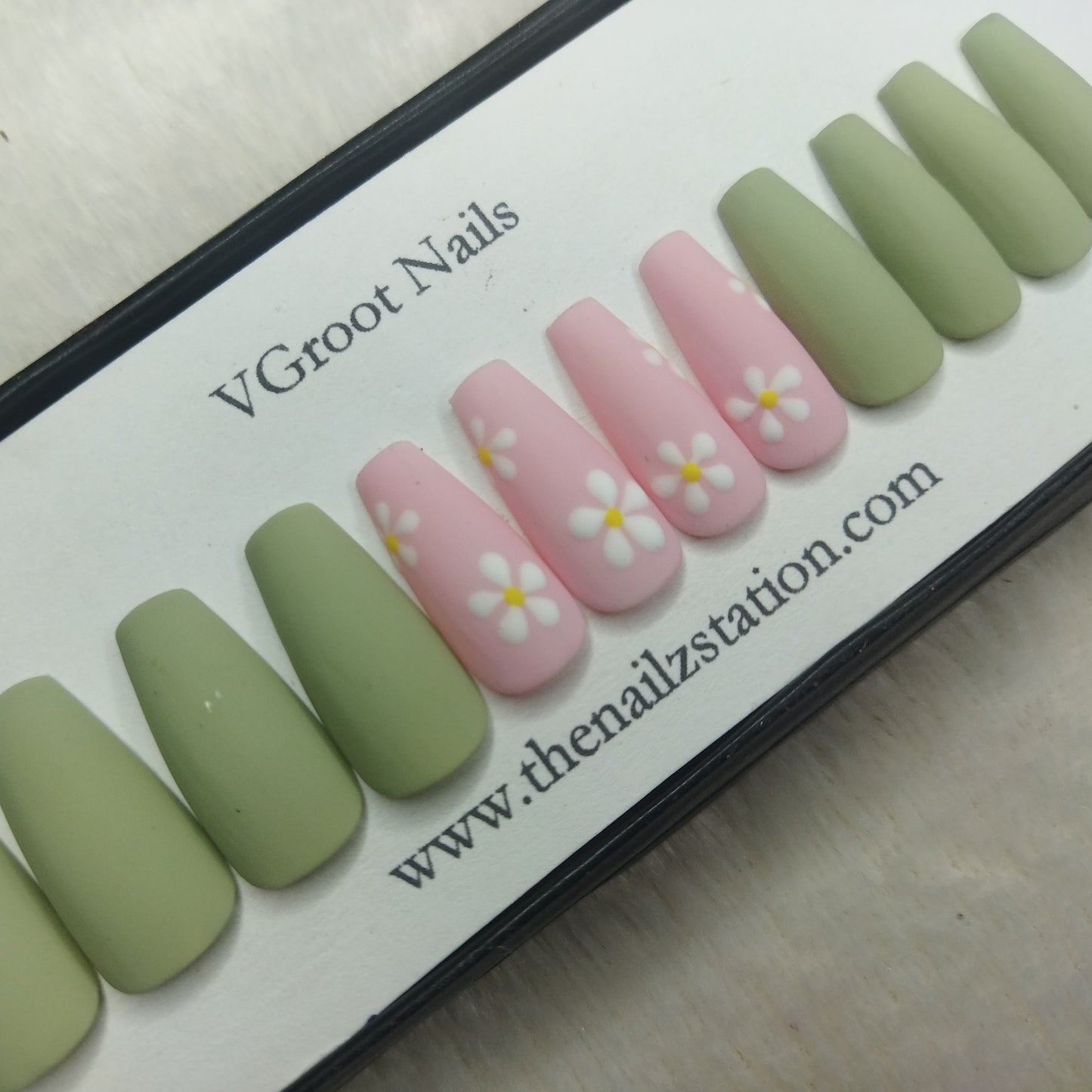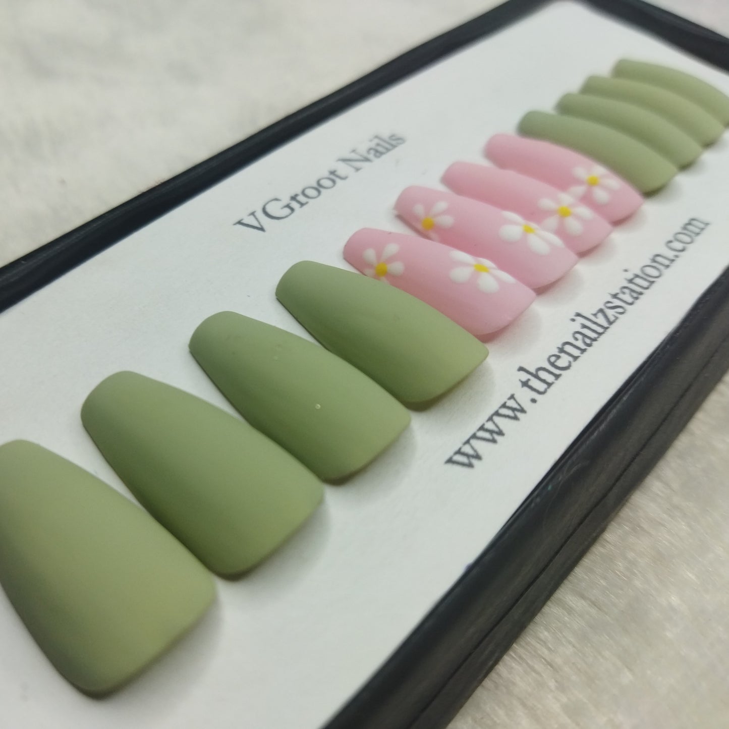 The NailzStation Matte Light Green Floral Press on Fake Artificial Nails Set with glue, filer, sticker application kit // 1158