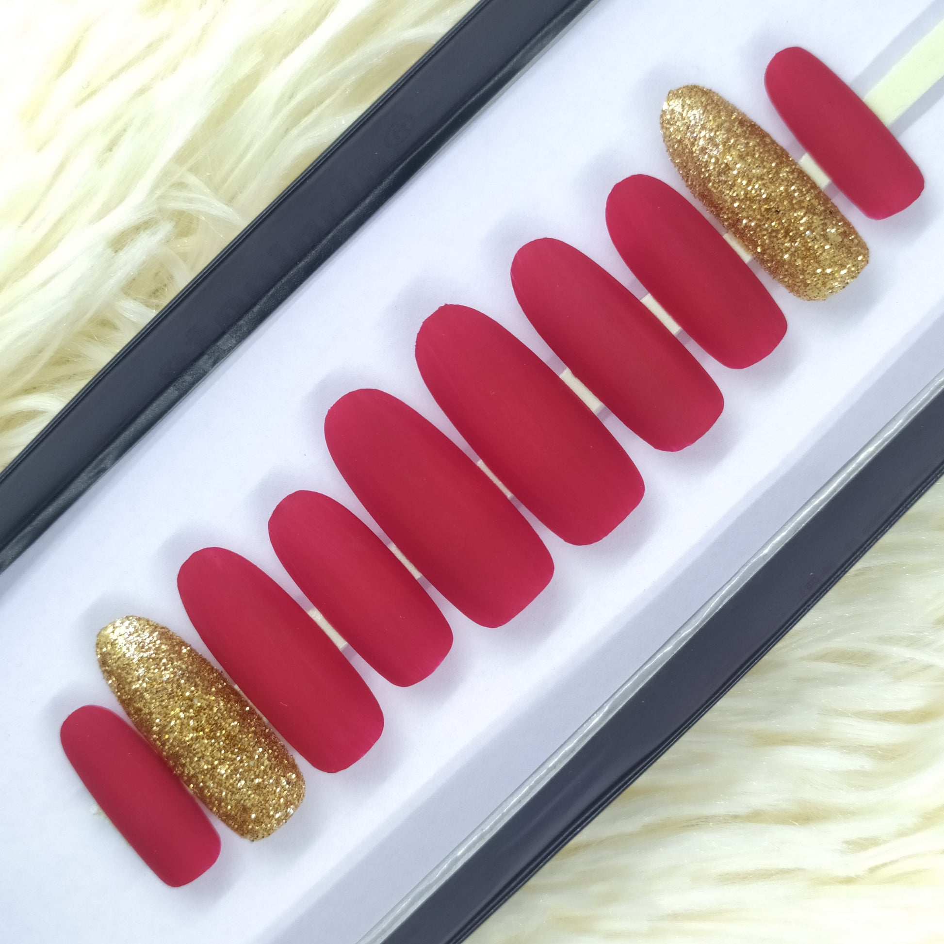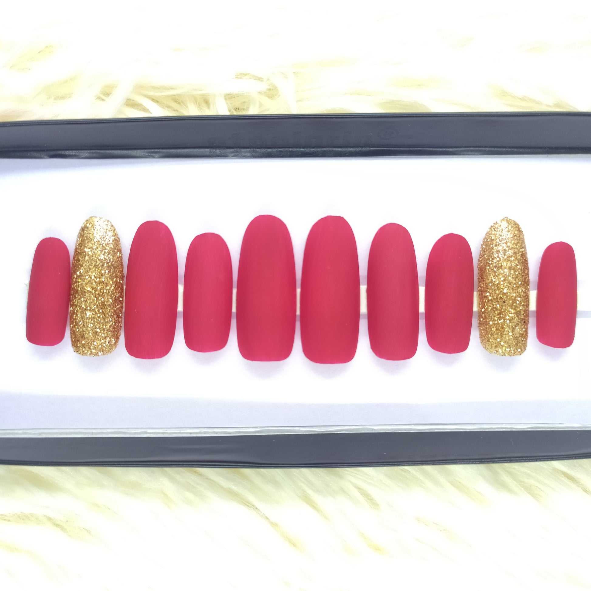 The NailzStation Matte Maroon Glitter Press on Fake Artificial Nails Set with glue, filer, sticker application kit // 1372
