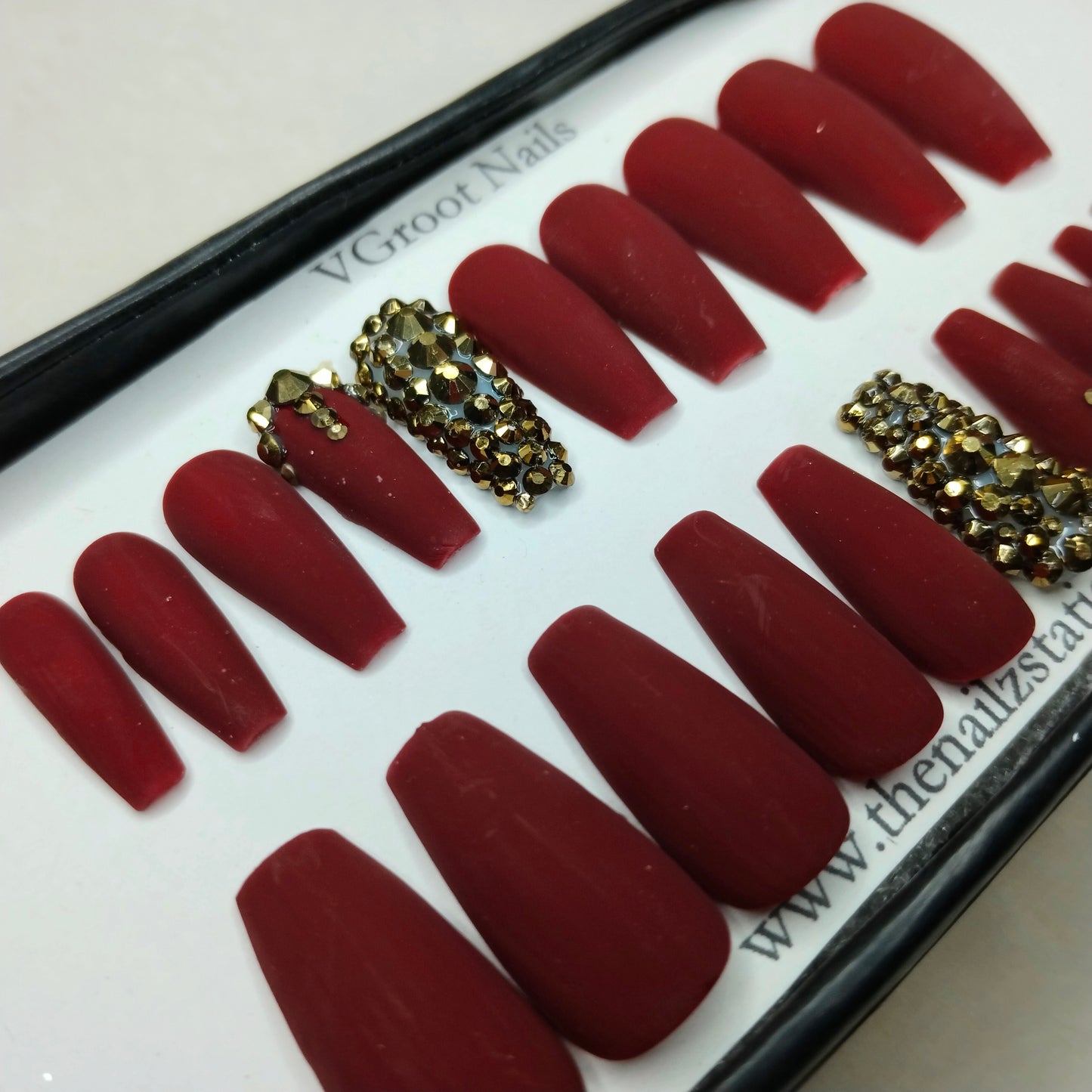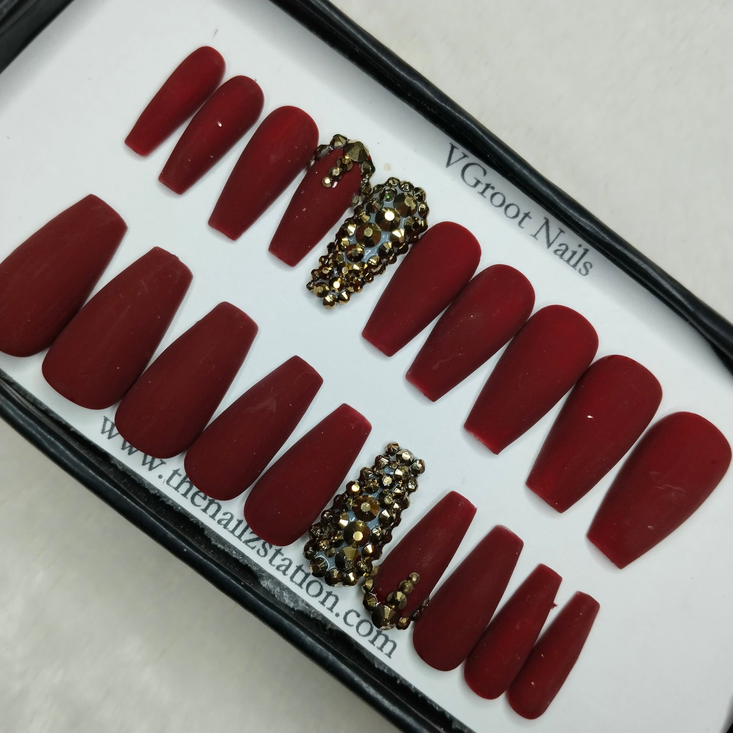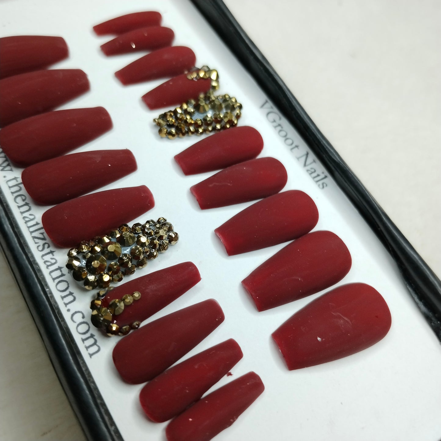 The NailzStation Matte Maroon Studded Press on Fake Artificial Nails Set with glue, filer, sticker application kit // 1181
