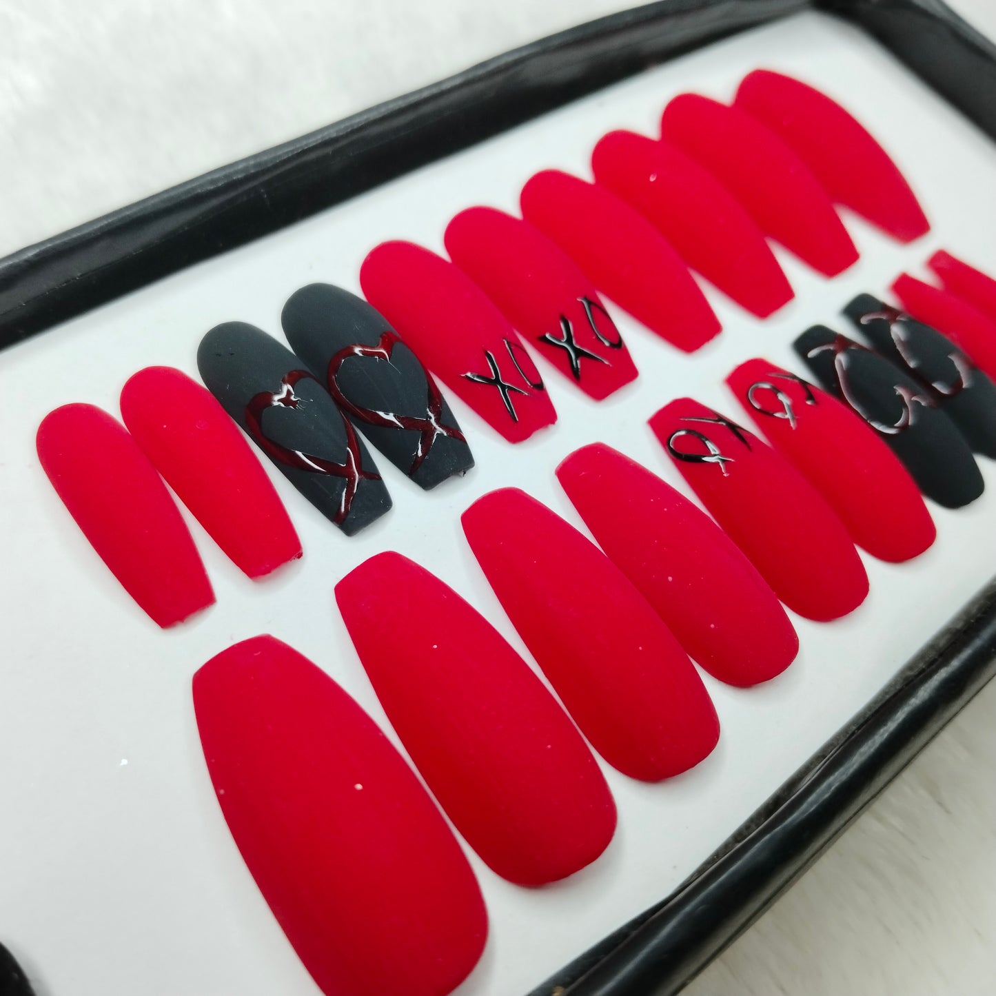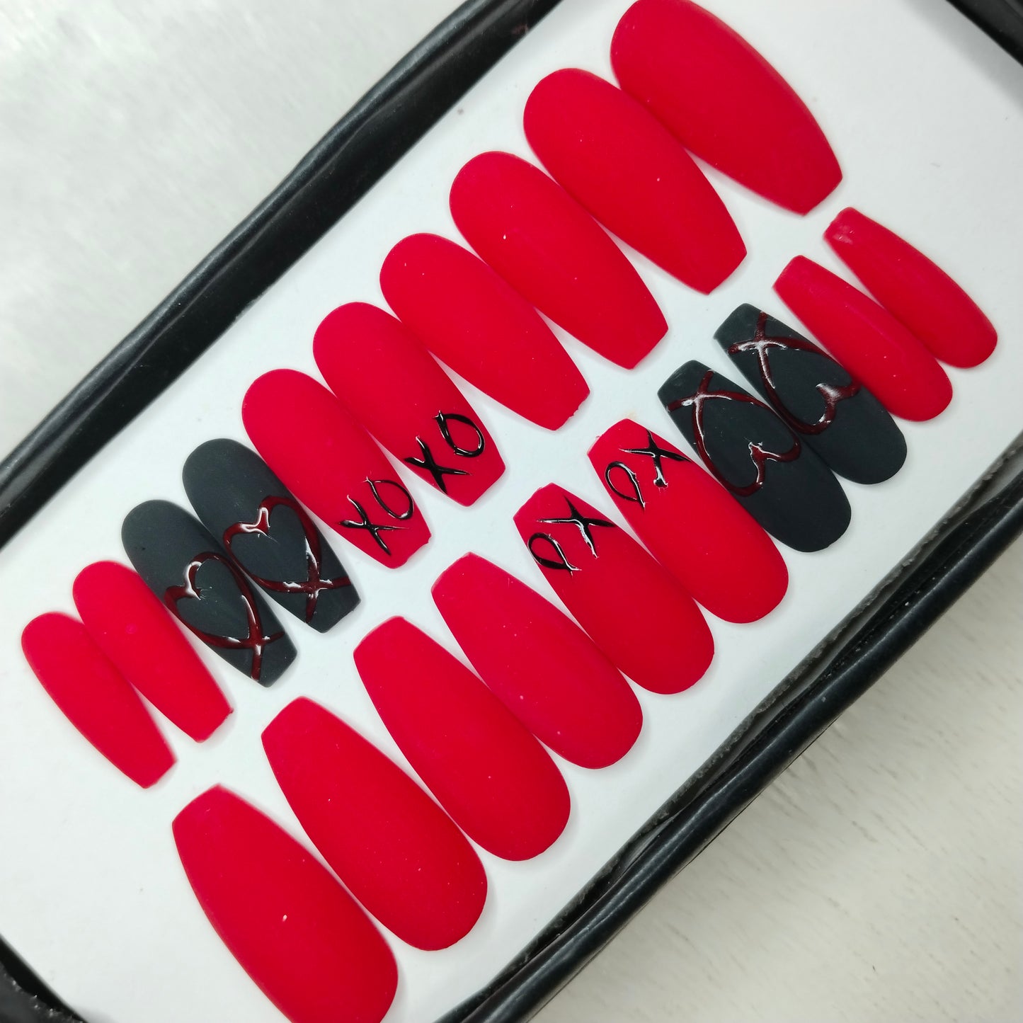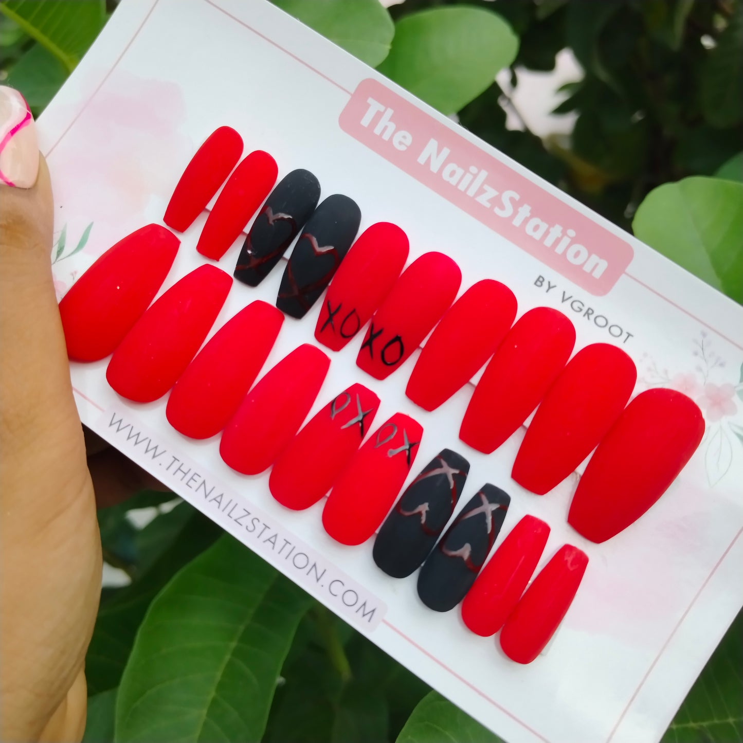 The NailzStation Matte Red Hearts Press on Fake Artificial Nails Set with glue, filer, sticker application kit // 1242
