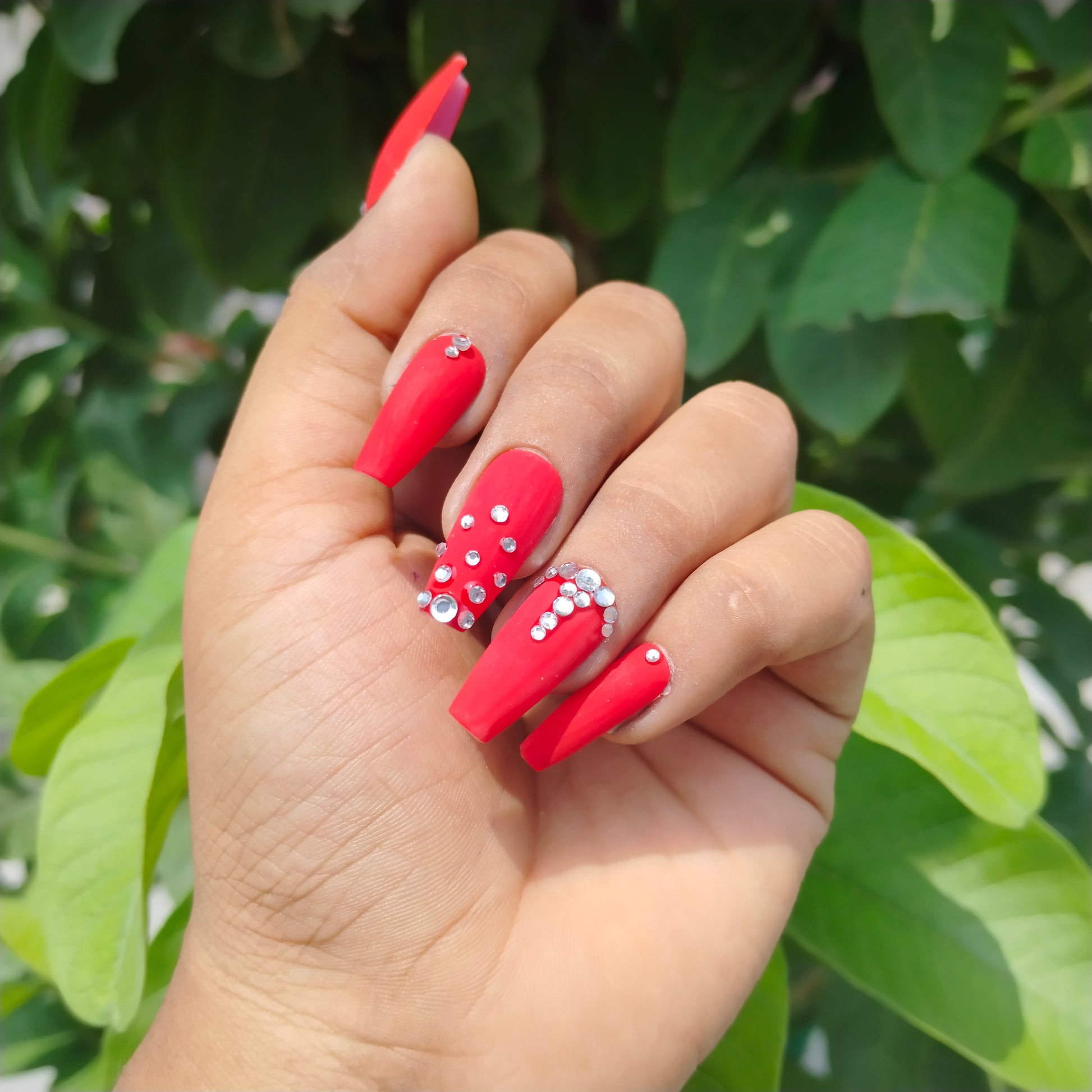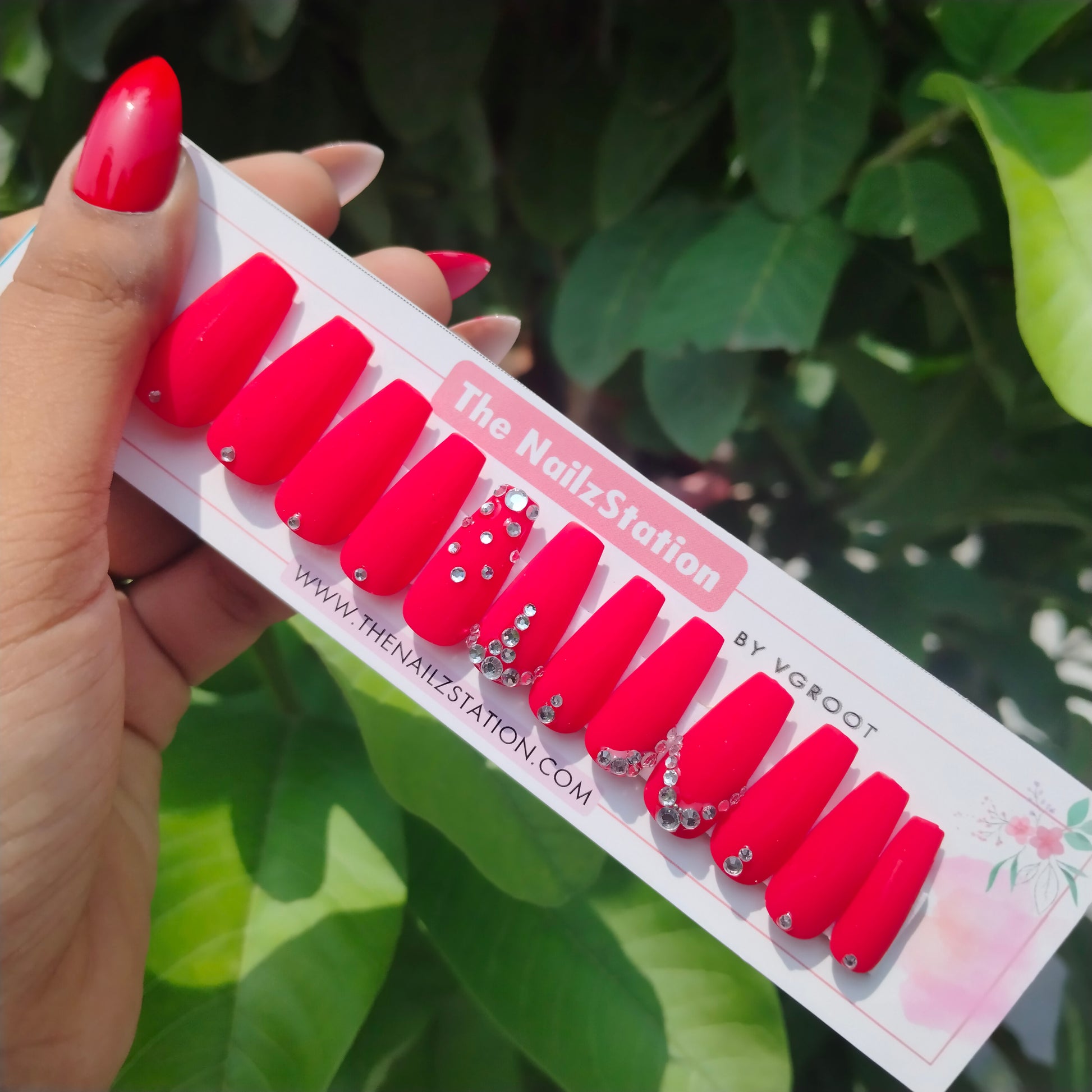 The NailzStation Matte Red Studded Press on Fake Artificial Nails Set with glue, filer, sticker application kit // 1249