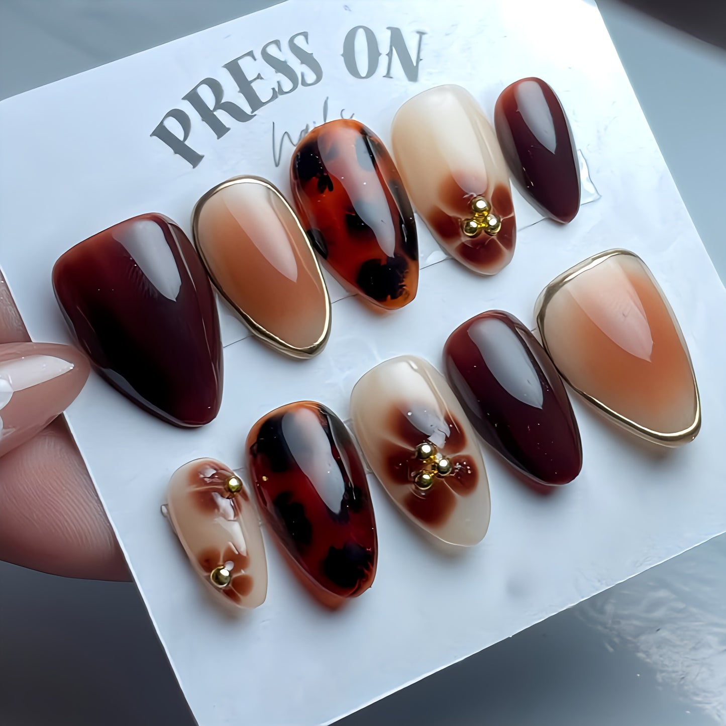 This designer press-on set blends deep maroon, amber tortoise shell, and soft nude shades with gold accents for a rich, elegant look. The glossy finish and mixed shapes give a modern, high-end feel. Comes with 20 nails and a full glue kit. Reusable and easy to apply—no salon visit needed.